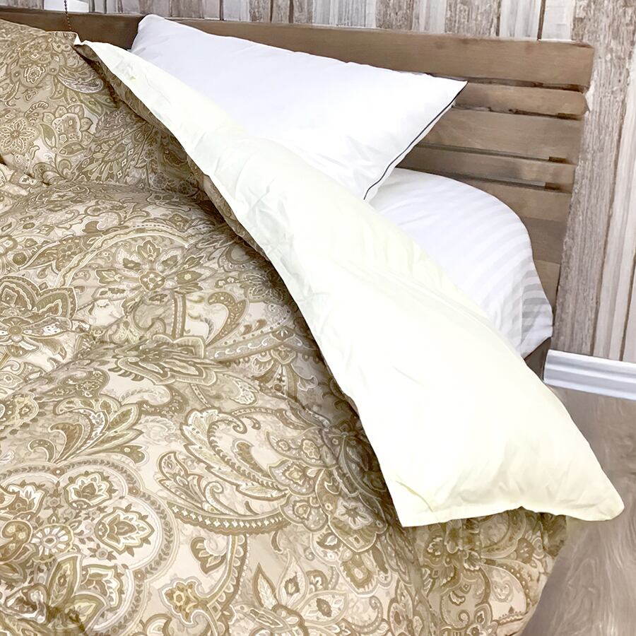 ダウン50%・フェザー50%の中綿を1.0kg充填。羽毛のふっくら感と暖かさを保ちながら、女性やご高齢の方でも取り扱いやすい軽量設計です。